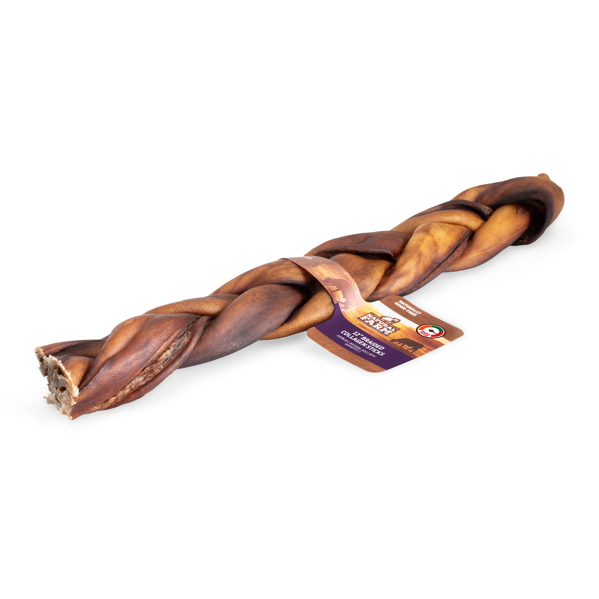 All the fantastic benefits of collagen and braided for added engagement & chew time – Our Braided Collagen Sticks offer your dog well-rounded skin, coat & joint health, mental stimulation, and loads of entertainment! Made from 100% all-natural beef skin from premium, grass-fed cattle, these long-lasting chews are as enriching as they are enjoyable. They also naturally work to scrape away plaque and tartar for a mouthwatering, breath-freshening chew experience that just can’t be beaten! Free of chemicals, hormones & antibiotics. These wholesome and highly digestible chews are a better and safer alternative to traditional rawhide. Best for medium-to-heavy chewers.