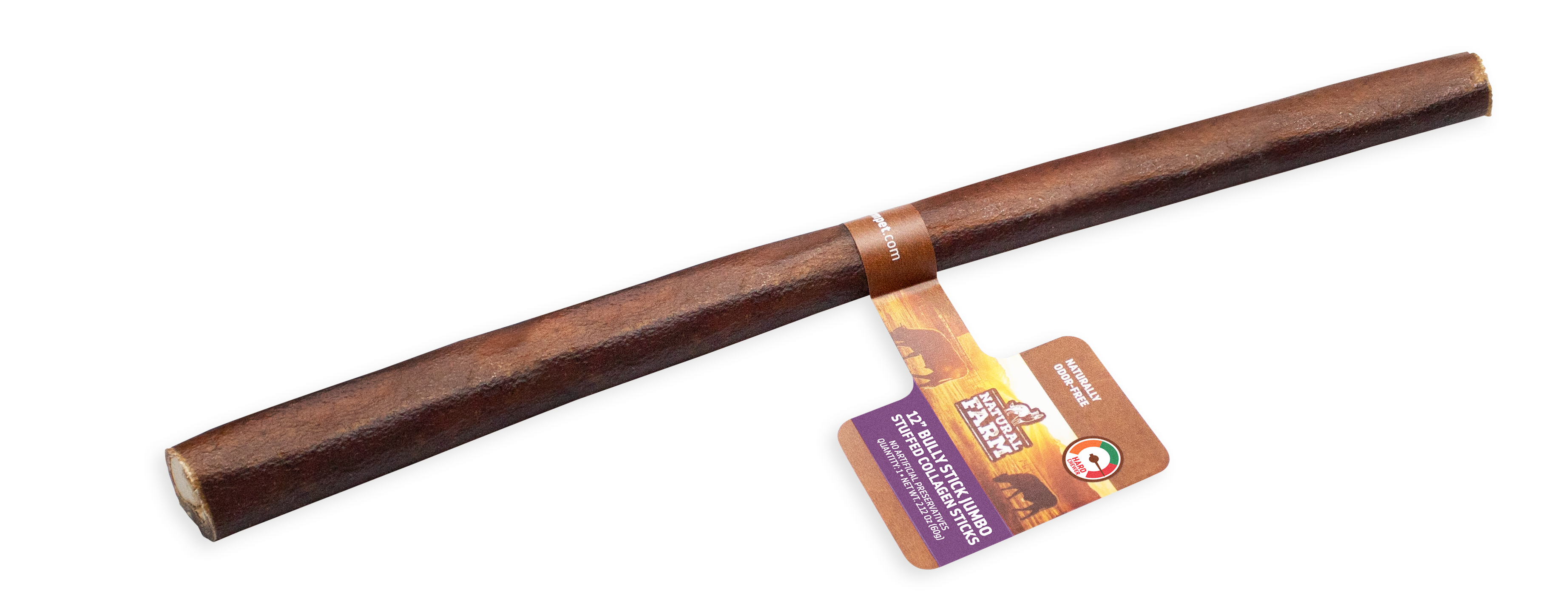 Our Jumbo Bully Stick Stuffed Collagen Sticks combine dogs’ two favorite flavors to create the ultimate chew full of indulgent enrichment. Dogs will delight in two textures offering loads of mental stimulation. They’re also packed with protein and collagen for well-rounded skin, coat, joint, and muscle support. Extra thick nature provides dogs with an ultra-long-lasting chew experience and endless entertainment. Formulated with all-natural, limited ingredients from grass-fed, free-range beef that’s free of chemicals, hormones, and antibiotics. Perfect for hard chewers. Recommended for medium to large breeds.