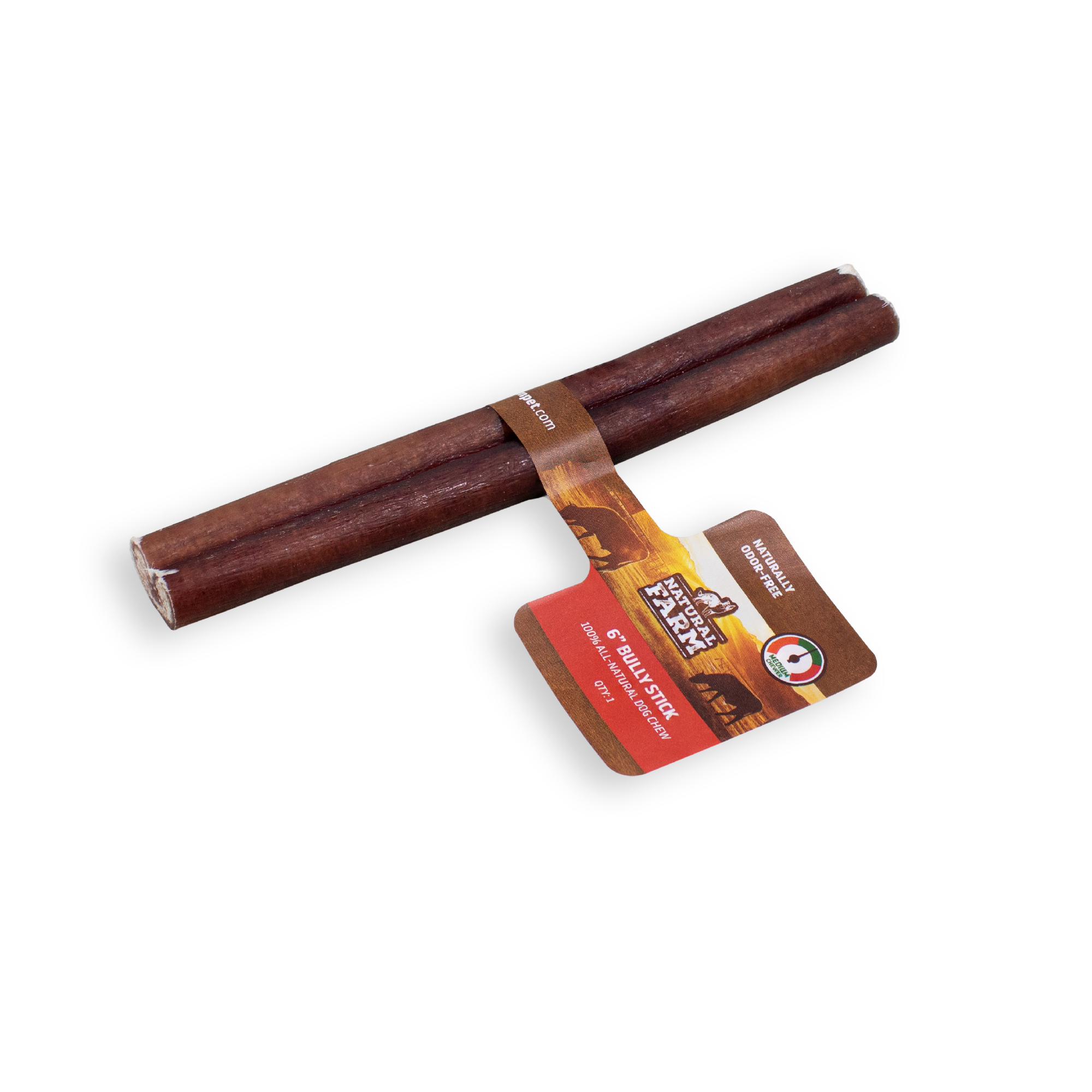 A naturally exciting and healthy dog chew treat! Fully digestible and highly engaging, Natural Farm’s 6 Inch Bully Sticks provide dogs with an outlet for excess energy and a boost of amino acids for a brilliant coat, mind, and body. Long-lasting and delicious. A great way to keep any dogs busy and support dental health. Natural fun without unnatural ingredients like chemicals, preservatives, and additives. And we only use grass-fed and -finished, hormone-free, free-range beef.